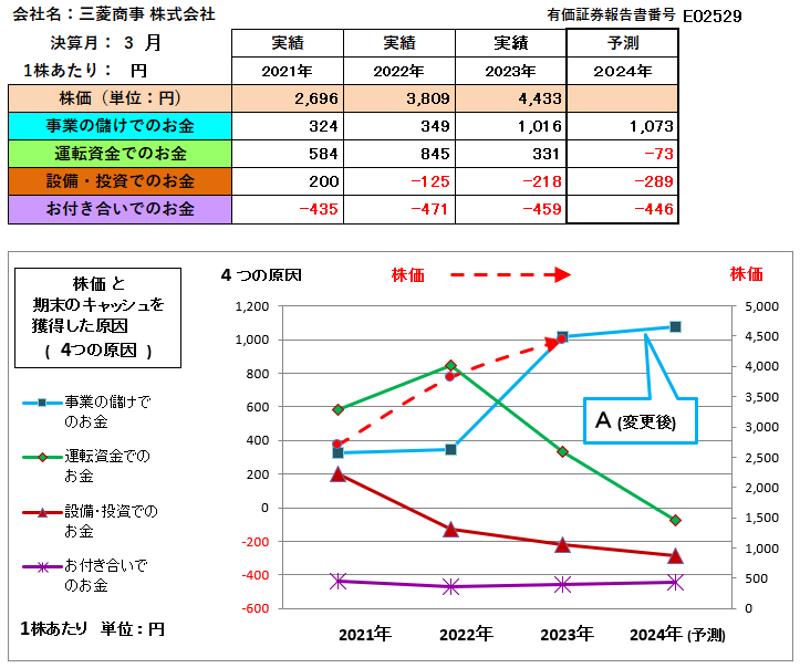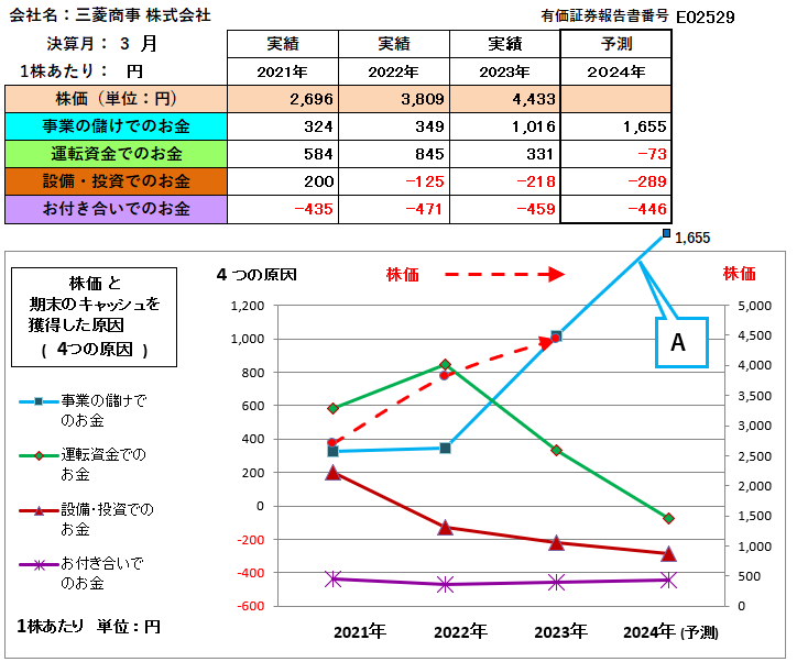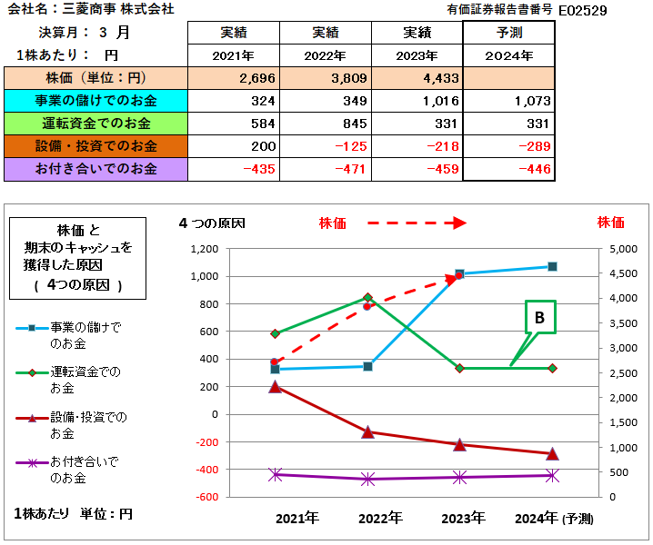 以上、三菱商事(株)さんのグラフを例に、各期末に保有している現金・預金(キャッシュ)を、4つの原因 ( 1株あたり ) で分析したグラフの説明をしました。株価は財務以外の様々な要因でも動きますが、それらの経済的、社会的、技術的変革に対して、各々の企業は「未来をつくる」ために、経営戦略を構築しています。そして、その経営戦略は財務戦略として現れますから、私たちのような株の素人といえども、少なくとも大枠の財務の動きぐらいは押さえて株価判断をしたいと思います。