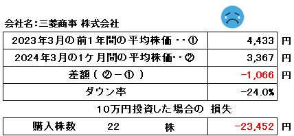 なお、、三菱商事(株)さんの今年の2024年3月の株価は下記のとおりでした。「2023年3月の前1年間の平均株価」は、有価証券報告書に記載されている最高株価と最低株価の単純な平均で、2024年3月の株価は「日本証券所取引グループ」が公開している3月の最高株価と最低株価の単純な平均です。4月の平均は3,516円でした。結論めいた話をすれば、グラフがシンプルであればあるほど株価の上昇と結びつくようです。逆もまた真で、グラフが複雑な動きを示す場合は、株価は素直に上昇しないようです。