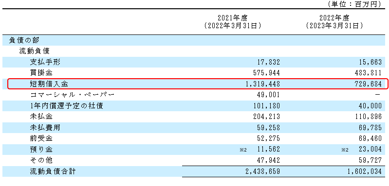 短期借入金(1年以内に返済しなければならない借入)は「運転資金でのお金」とみなします。したがって、「運転資金でのお金」である緑色のグラフが2022年➡2023年に急減少している原因を有価証券報告書で確認しますと、下記の朱色の枠で囲んだ「短期借入金」が約5,897億円減少(返済)していて、2023年3月決算では約7,296億円の残高となっています。