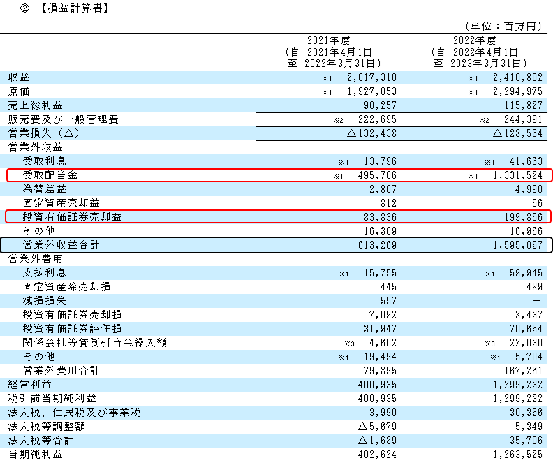 「事業の儲けでのお金」が2022年➡2023年に急上昇した原因を有価証券報告書で確認しますと、下記の朱色の枠で囲んだ「受取配当金」が約8,358億円急増し、「投資有価証券売却益」が約1,160億円増加した結果として「営業外収益」(黒枠)の合計残高は1兆5,950億円となり、売上高(収益)に対しての割合は66.16%と異常に高くなっています。したがって、2022年の実績である30.4%で予測変更をしました。