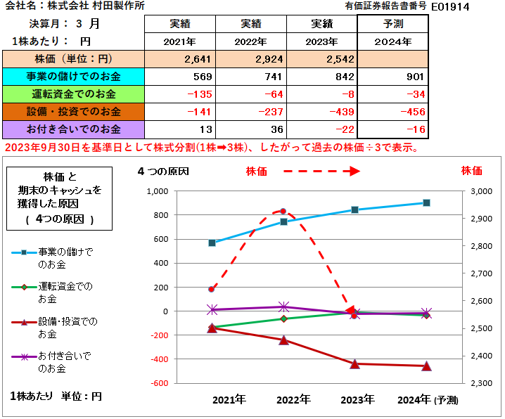 (株)村田製作所のグラフは、「株当てクイズ」で4月8日に提供(6月23日修正再提供)しましたが、下図のグラフを見る限り、今年5月の株価の上昇を予測されるのでは、と思います。【なお、株式分割が2023年9月30日を基準日として行われたため、実績における株価は、有価証券報告書に記載の各期3月決算前の1年間の最高株価と最低株価の単純な平均値の3分の1で表示しています。】