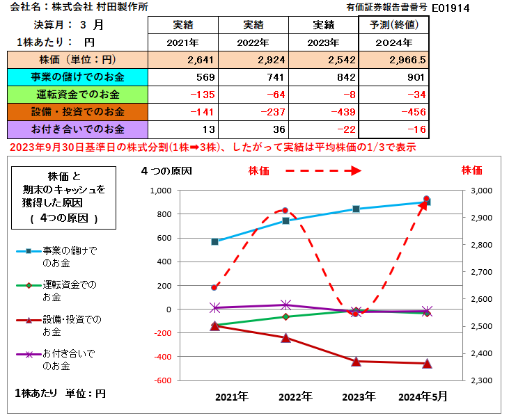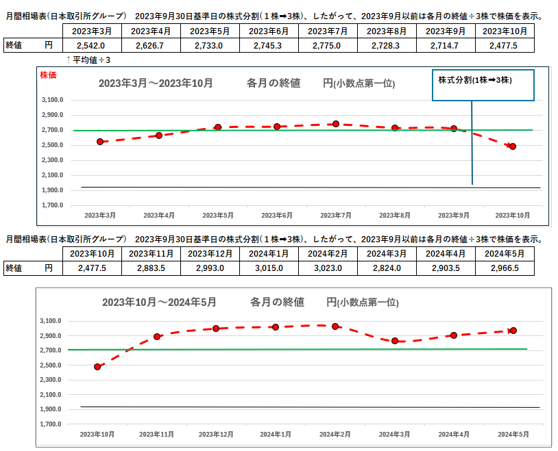 青色のグラフが天に向かっている、すなわち「事業の儲けでのお金」が順調に伸びているのに株価が下がっているのは、財務的にはおかしい。したがって、今後は「反転上昇するはずだ」との判断ができます。上記のグラフに2024年5月の終値(「月間相場表/日本取引所グループ)を追加表示したのが下図のグラフです。
