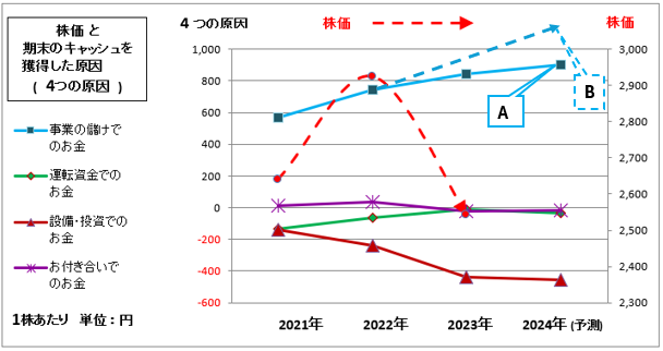 例えば、サラリーマンの方の給与が下がったとしても、直ちにサラリーマンの方が毎月預金している残高が急に減少してしまうことはありません。つまり、今まで3万円の預金が1万円になるようなものです。企業も同様です。下図のように「事業の儲けでのお金」の伸びは少なくなったとしても、伸びていくことに変わりはありません。2023年3月の決算の利益が前年と同額だとすれば、Bで表示の青い点線のグラフであったのですが、利益が前年より減少しているため、伸びが少なくなりAで表示の青い線のグラフとなっているのです。