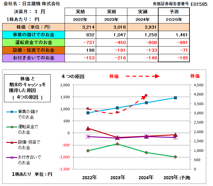 日立建機が毎決算期末に保有する現金・預金(キャッシュ)を、その獲得した4つの手段である①「事業の儲けで獲得したお金」、②「運転資金で獲得したお金」、③「設備・投資等の長期資金で獲得したお金」、④「お付き合いで獲得したお金」で区分したグラフは下図のとおりで、最も重要な青色のグラフである「事業の儲けで獲得したお金」は順調に上昇しています。( 株価は「終値」でなく、有価証券報告書に記載されている各決算前の1年間の「最高株価と最低株価の単純な平均値」です。) したがって、財務面から株価は順調にアップしていくものと予測されますが、実際は乱高下しました。