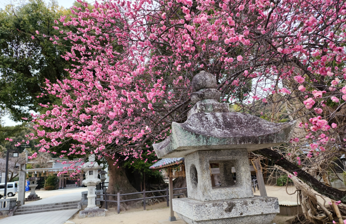 今週の「九州テクテク歩き」:筑前の国(福岡県)の春日市の人々にさほど知られていない神社の境内に紅梅が力いっぱい咲いていました。