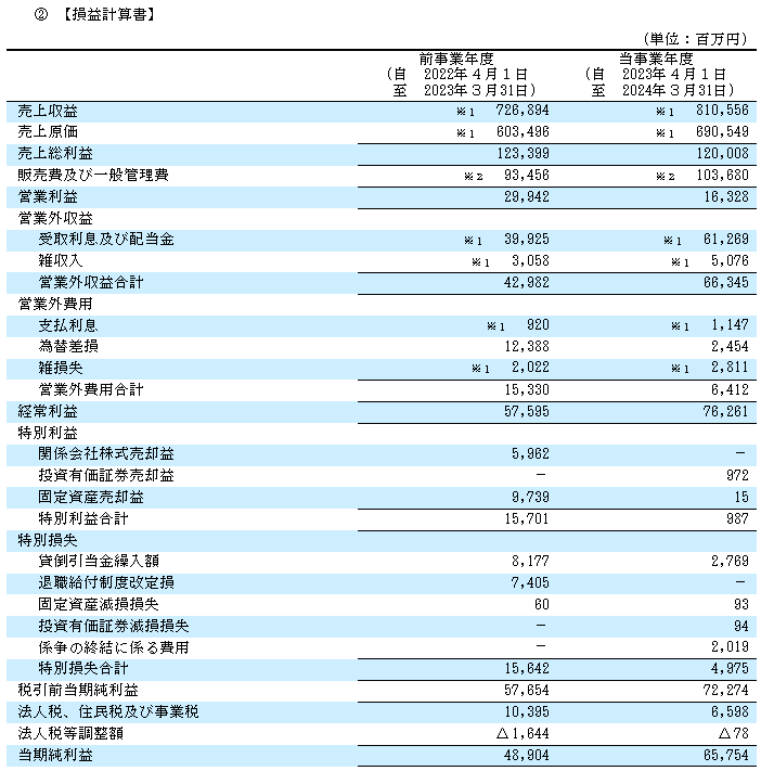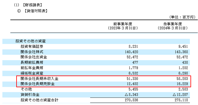 2023年3月決算で「関係会社長期未収金」が約513億円と多額に発生しましたが、2024年3月決算ではどうなったのでしょうか?有価証券報告書をみてみますと2024年3月決算では、その残高は約582億円と約69億円増加しています。また、2023年3月には、「その他」に表示されていた「関係会社長期売掛金」が新たに記載されています。