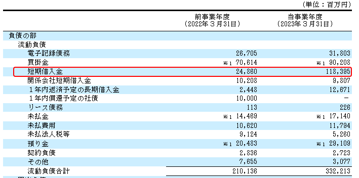 緑のグラフである「運転資金で獲得したお金」が増加する典型的な例は、短期の借入をする場合、または、買掛金などの営業債務が多額となり売掛金などの営業債権が少額となる場合ですが、同社の2023年3月の有価証券報告書をみると前者の例である短期借入金が急増しています。そのため緑色のグラフが急減したのです。