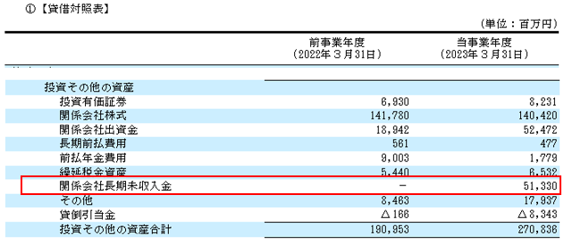 茶色のグラフである「設備・投資等で獲得したお金」が減少する典型的な例は、投資が急増するか、その投資のために調達した長期借入金や社債が急減するかです。2023年3月の有価証券報告書をみると投資が急増しています。つまり、関係会社長期未収入金(関係会社への債権ですが長期ですから「投資」として分析しています。)が新たに発生しています。そのため茶色のグラフが急減したのです。