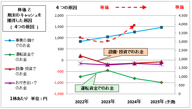 今後の株価判断は、青色のグラフである「事業の儲けで獲得したお金」は順調に上昇すると予測されていますが、今年2025年3月決算での「関係会社長期未収入金」「関係会社長期売掛金」の動向をもって判断すべきと思われます。なお、ここ3年間で「株価」が「事業の儲けで獲得したお金」の何倍で推移してきたかをみる限りでは、株を購入しても良い倍率となってます。