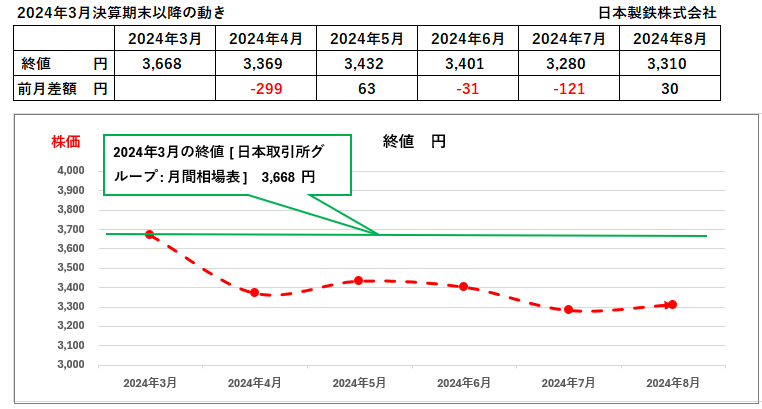 ちなみに、決算以降の各月の終値は下記のとおり下がっています。ただし、問題は1年後の2025年3月決算時点での株価は上がっているか、下がっているかです。つまり、この素人の株判断は1~2年の長期的視野で判断することを目的としているからです。