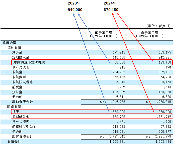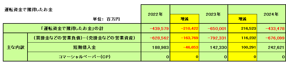 - 事業規模が大きいため、運転資金は常にマイナスとなりますが、2024年はその管理が一定程度改善されたか、短期借入でうまく資金繰りを行ったと考えられます。財務運営上、コントロールされている状態です。