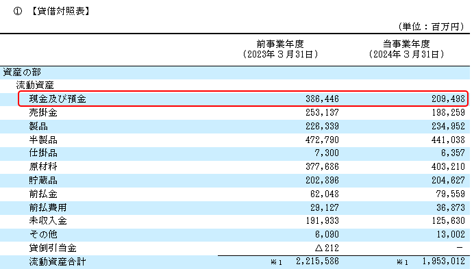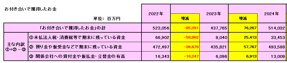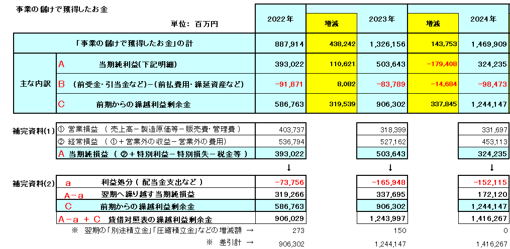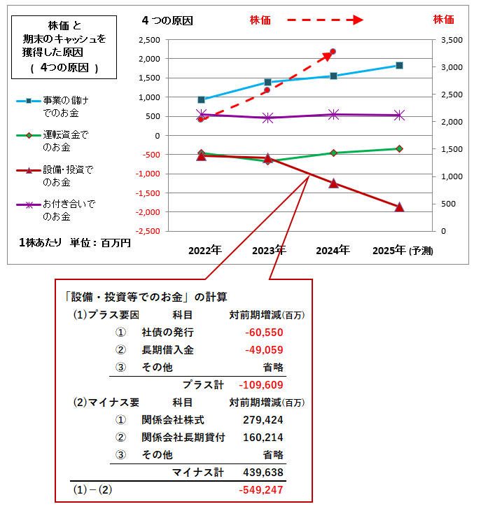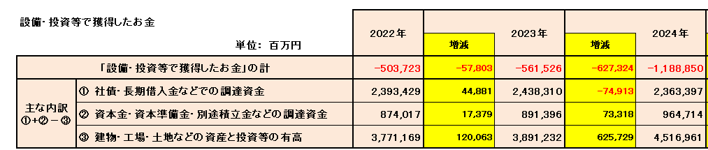 - 内訳を見ると、その原因は明らかです。「③建物・工場・土地などの資産と投資等の有高」が、2024年だけで6,257億円も増加しています。これは極めて大規模な設備投資や M&A を含む投資活動が行われたことを示します。