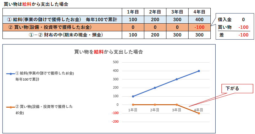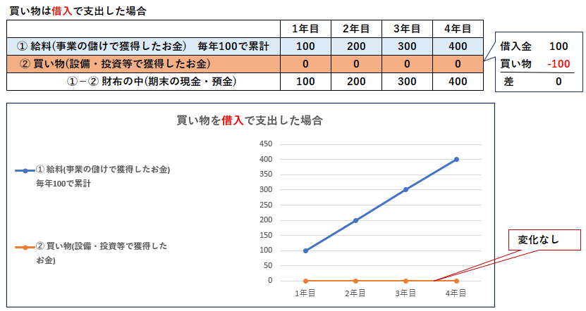 例えば、投資(買収)のために100を支出したとします。そしてその投資資金を「事業の儲けで獲得しているお金」100で支出したら、手持ちの現金・預金は100減少してしまいます。しかし、借金を100してその借金を買収資金100に充てたら、手持ちの現金・預金は減少しないで残ったままです。サラリーマンの例でいえば、100の買い物をするのに、給料日に貰った給料で100支出したのか、借入金100で支出したのかの違いと同じことで、グラフにしてみると下図のとおりになります。
