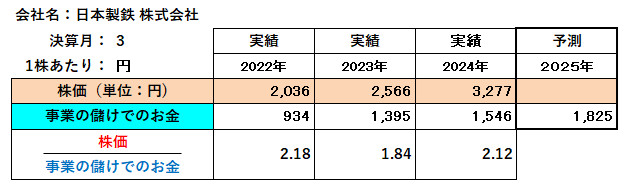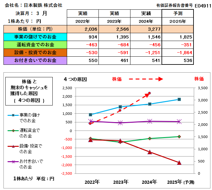 ご提示いただいた財務データと独自の分析グラフに基づき、日本製鉄株式会社の財務内容の分析と今後の株価予測をいたします。