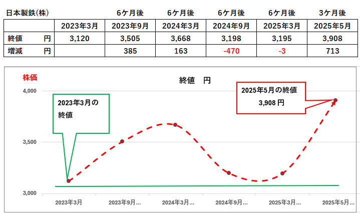 また、同社の2023年3月決算から6ケ月ごとの株価の「終値」の動きは下図のとおりです。( 昨年の2024年9月9日の投稿は、株価が下降し始めた2024年3月から2024年8月までの動きをでした。)