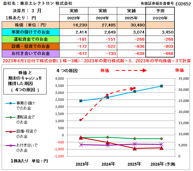• 内訳からの考察: 補足資料の「事業の儲けで獲得したお金」の内訳を見ると、主に「当期純利益」の増加が貢献しています。これは、売上高および営業利益の大幅な成長が背景にあり、半導体製造装置市場の活況を捉え、東京エレクトロンがその恩恵を最大限に享受していることを示しています。本業の収益性が極めて高く、企業の健全な成長を牽引していると評価できます。