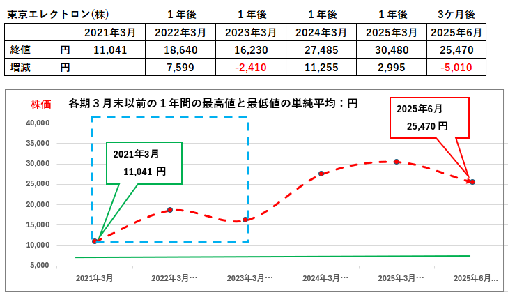 これらの分析に基づき、1年後(2026年3月期末時点)の東京エレクトロンの株価は、現在の株価(2025年3月期末の30,480円)から上昇し、おおよそ 34,000円~35,000円 の範囲になると予測します。
