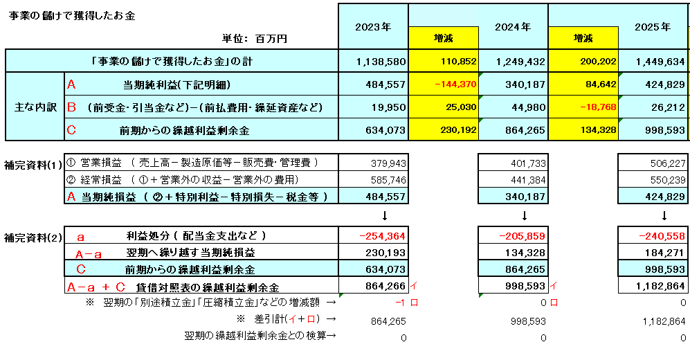 今年(2025年)の3月決算まで前1年間の事業の儲けで獲得したお金である「当期純利益」(A)は、前期に比べ約846億円増加し、「営業利益」(①)、「計上利益」(②)とも大きく増加しています。また、過去の「事業の儲けで獲得したお金」である「繰越利益剰余金」(C)も、配当金の支払などをした後でも順調に積み増ししています。