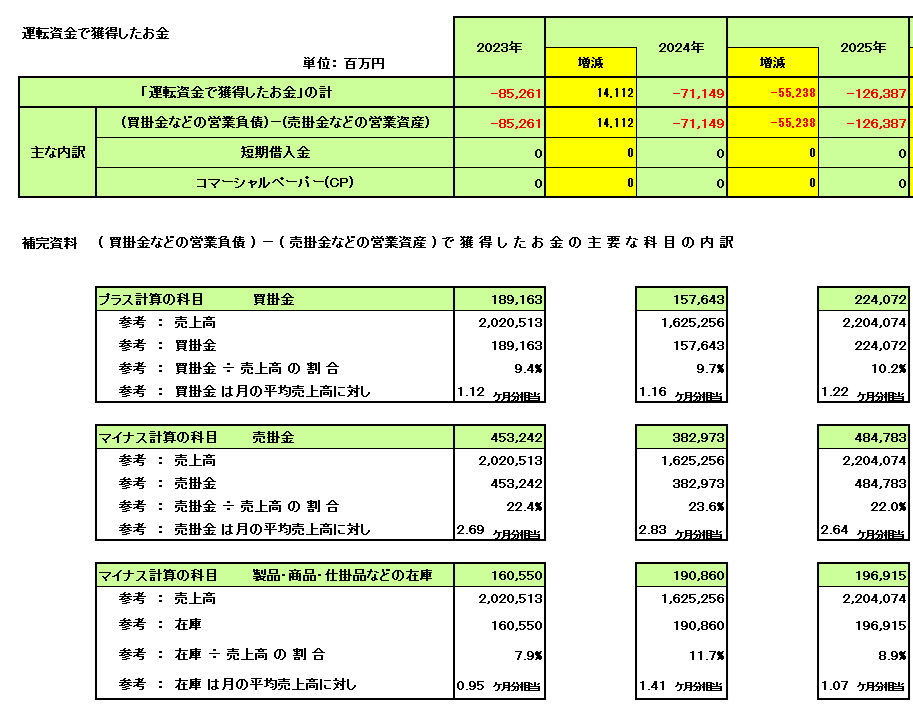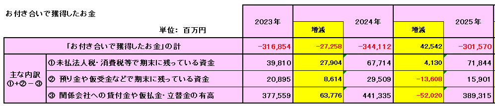 • 内訳からの考察: 「関係会社への貸付金や仮払金・立替金の有高」が最も大きなマイナス要因となっており、グループ内での資金提供が行われていることがわかります。2025年にはこの金額が減少し、全体のマイナス幅が縮小しています。これらは流動的な資金供給であり、企業グループ全体の資金管理の一環と考えられます。本業のキャッシュ創出力に比べれば、財務健全性への影響は小さいと言えます。