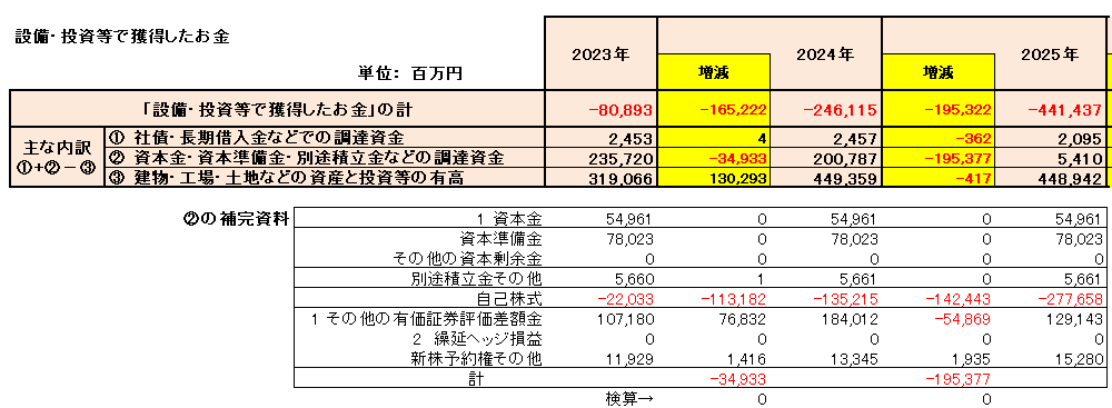 • 内訳からの考察: 主な要因は「自己株式」の多額な取得と「建物・工場・土地などの資産」への投資です。自己株式の取得は株主への積極的な還元策であり、1株あたりの価値向上に貢献します。また、設備投資は将来の生産能力増強や新技術開発に向けた不可欠な投資であり、将来の収益基盤を強化するものです。本業で得た潤沢なキャッシュを、成長投資と株主還元にバランス良く配分している、非常にポジティブな財務戦略と評価できます。