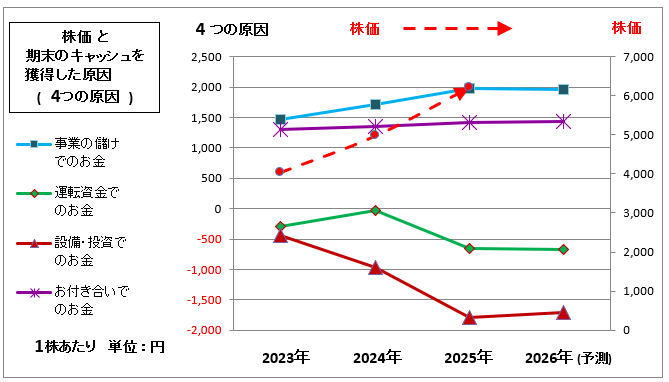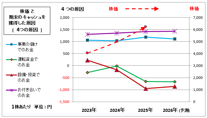 「株価」が「事業の儲けでのお金」の何倍で推移しているかをみると、2023年の3.81倍から2024年が4.81倍と高くなり、さらに2025年は5.26倍と高くなっています。したがって、現在まで上昇を続けてきましたが、財務内容は良いとしても、そろそろ頭打ちかなと思われるかもしれません。
