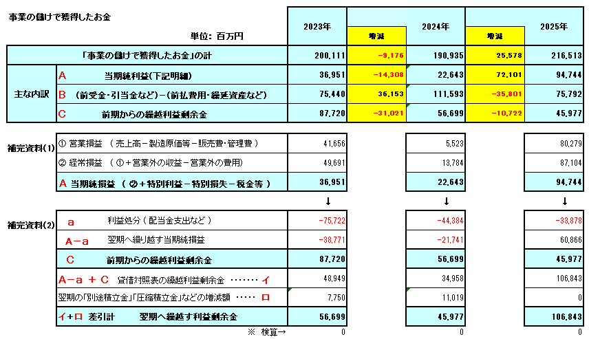 o 補足資料(事業の儲けで獲得したお金)を見ると、当期純利益が大きく増加しており、これが「事業の儲けで獲得したお金」の増加に寄与していると考えられます。売上高も堅調に伸びており、収益構造の改善が見られます。
