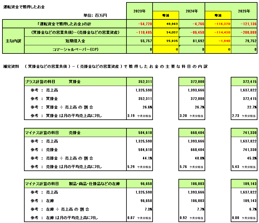 o この項目は、2023年の-290円から2024年は-26円、2025年は-661円と、マイナスの幅が拡大する傾向にあります。これは、売掛金や棚卸資産などの流動資産が増加している一方で、支払手形や買掛金などの流動負債の増加がそれらを上回っている、または流動資産の増加よりも流動負債の減少が大きくなっていることを示唆します。
