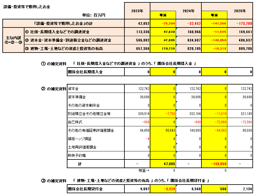 2025年の「設備・投資等でのお金」がマイナスへ向けて大きく下落している大きな原因は、自己株式を720億円も取得したため ( 下図②の補完資料の自己株式欄、なお、取得であって償却するかどうかは今後のこととなります) 、設備・投資等の資金の調達先の1つである資本金その他の金額が少なくなった ( 下図② )ためです。また、長期の借入金等の返済 ( 下図① ) も進んでいる他に、新たに600億円の有価証券を取得 ( 下図③ の数字に含まれています) していますが、設備・投資等の在高そのものは183億円減少しています。