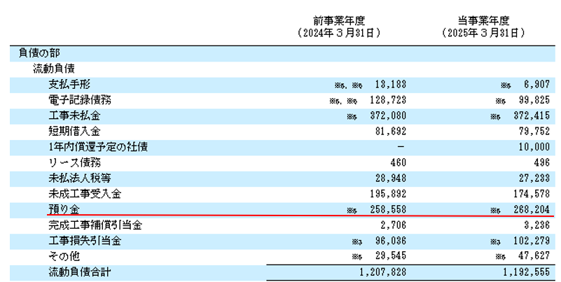 この内訳表は、財務諸表の「貸借対照表」(決算期末に存在する残高を表示したもの)から計算しますから、その貸借対照表に「関係会社短期借入金」や「関係会社短期貸付金」の表示がない場合には計算されず「子会社などの関係会社との資金のやり取りはない」と判断されます。しかし、大成建設の「貸借対照表」には「預り金」が2,682億円も多額に計上されています。そしてその預り金についての注記事項をみると、「関係会社に関する預り金」が2024年で1,110億円、2025年1,188億円となってました。つまり、預り金という科目の中に子会社などの関係会社との取引があったわけです。このことが、紫色のグラフ「お付き合いで獲得したお金」が青色のグラフ「事業の儲けで獲得したお金」より上位にある大きな原因となっています。