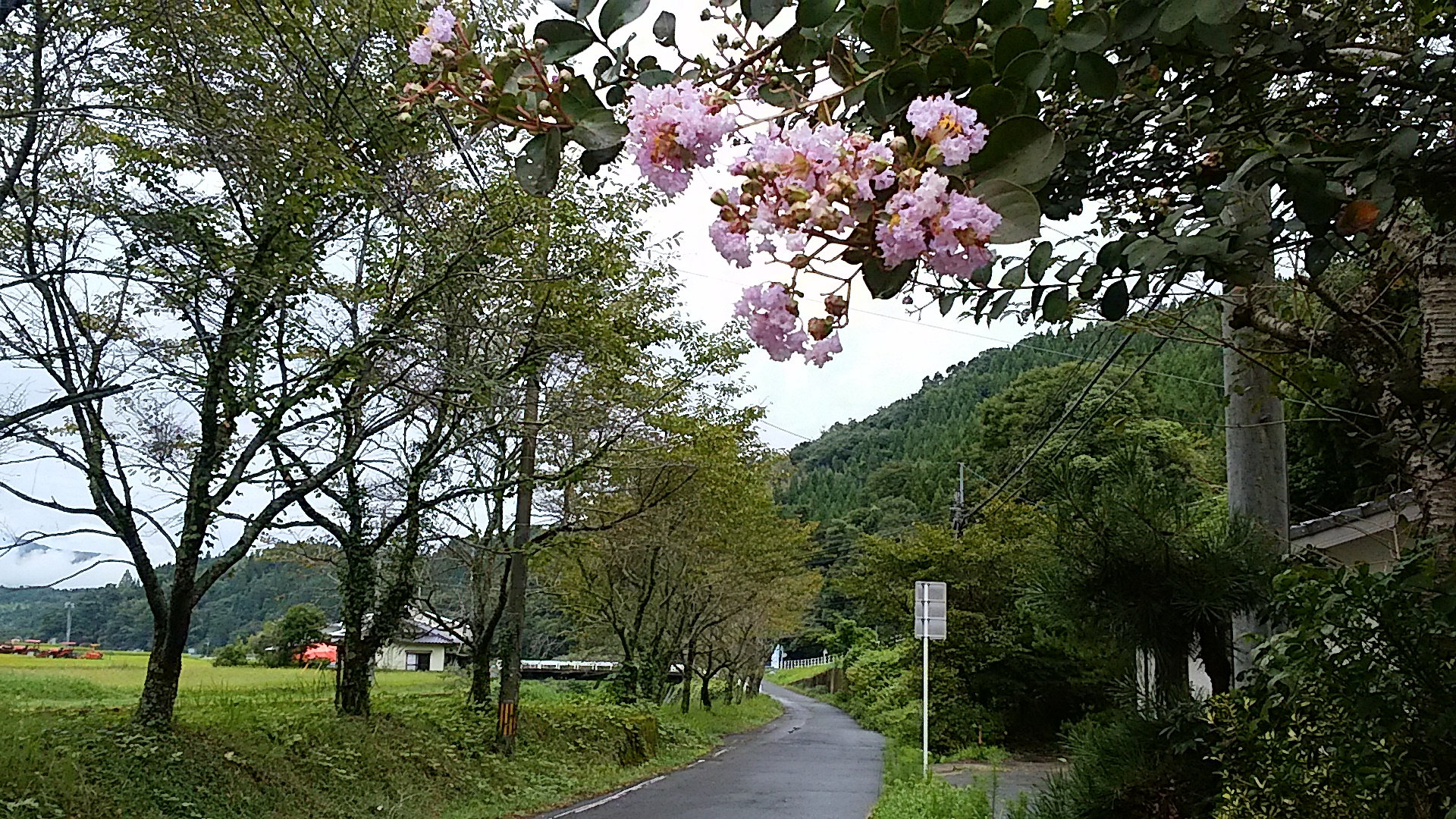 今週の「九州テクテク歩き」:豊後の国(大分県)の玖珠町にある清水瀑園(しみずばくえん:豊の国名水15選の一つで、森の間から突然湧出する清水がいくつもの滝をつくってます ) からの帰り道に、ふと見上げれば、頭上に名も知らぬ9月上旬の花が咲いてました。