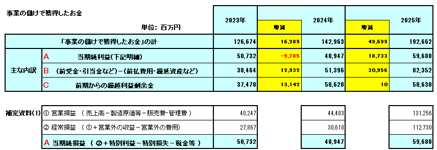 特に、2025年の「設備・投資等の長期資金で獲得したお金」のマイナスは、大規模な投資活動や事業再編が行われた可能性を示唆しており、その内容を注視する必要があります。