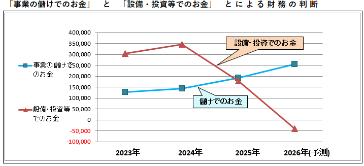 「事業の儲けでのお金」が潤沢にあるからこそ「設備・投資等でのお金」の巨額の支出をすることが可能です。グラフの動きでいえば、青色のグラフが上昇しているからこそ、茶色のクラフが下降しているともいえますが、この巨額の設備・投資等の支出が、将来の事業の儲けでのお金をさらに多く生み出すことが期待されます。なお、この「設備・投資等でのお金」の2026年の予測は、2025年の投資の増加額と同様と仮定して予測した数値です。これらのことについて人工知能( AI )の回答にもご留意ください。