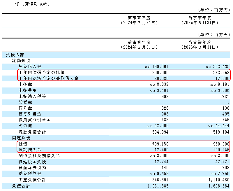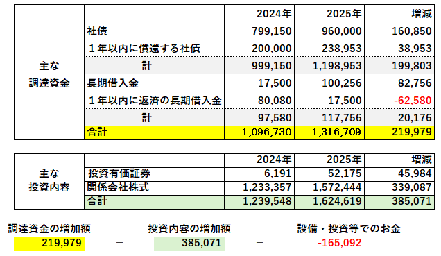 このグラフの最大の特徴は、茶色のグラフである「設備・投資等でのお金」が、2025年3月決算では前期からマイナスへ向けて急落していることです。将来のための大きな投資支出によりお金が社外に流出したためでしょうか? それとも多額の社債の償還や長期借入金の返済のためにお金が社外に流出したためでしょうか?
