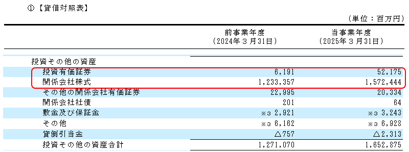 SBIホールディングスは、2025年3月決算において「関係会社株式」を約3,390億円増加させています。また、「投資有価証券」も約459憶円増加させています。つまり、将来の成長戦略のための多額の投資活動を約3,850億円していたことが分かります。そして、その投資の必要資金約57%の約2,200億円を、主に「社債」の発行と「長期借入金」の増額でまかなっています。その結果、「設備・投資等でのお金」の計算ではマイナス約1,651億円となり、このマイナスとなっている不足額は、短期借入金の増加(緑色のグラフの上昇)と事業の儲けでのお金(青のグラフの上昇)でのお金で対応しています。