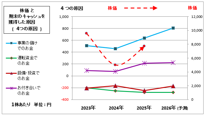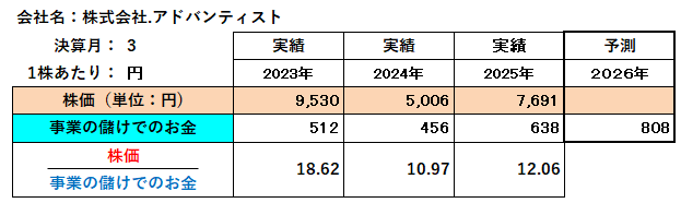 青色のグラフが予測の2026年3月に向かって急上昇していますから、今後も株価は上がると判断します。さらに、「株価」が「事業の儲けでのお金」の何倍で推移しているかをみると、割高気味と思われますが2025年は12.06倍で2023年の18.62倍より低い状況です。したがって、「来年に向けて株価は上昇する」と判断します。(株価はその年の最高株価と最低株価の単純平均値です。)