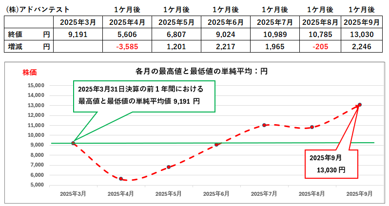アトバンテストの株価は2025年3月の決算後の4月から急上昇しています。ただし、先月の9月まで半年間の動向ですから、「素人の株判断」では、日々の株価の上下に一喜一憂しないで長いスパン、つまり1年後や2年後の期間で判断します。ただし、財務内容からの判断であり、株式市場の動向や半導体業界を取り巻く環境の変化などは考慮外としています。