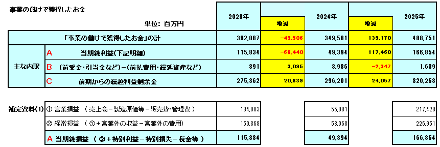 ここで「利益」だけでない「事業の儲けでのお金」(下図)についてみれば、「利益」(当期純利益)の減少ほど青色のグラフである「事業の儲けでのお金」は減少していません。