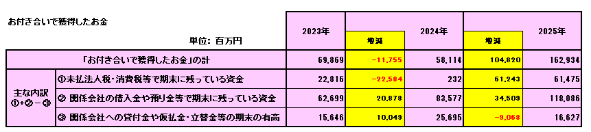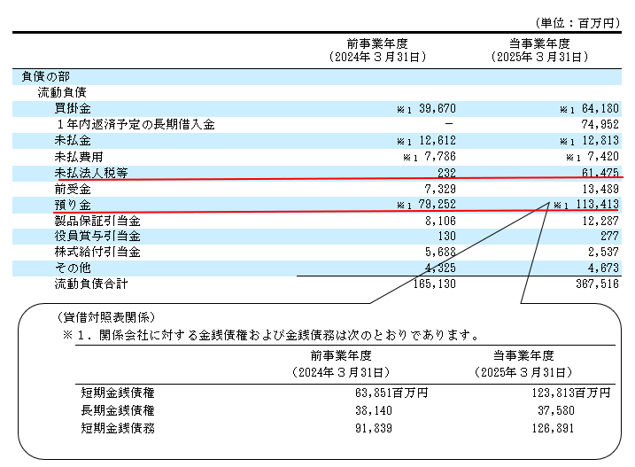 2025年の有価証券報告書をみると「未払法人税等」が約614億円で前年に比べて612憶円 ( 上図の① ) も増加しました。また「預り金」は約1,134億円で前年に比べて約341億円 ( 上図の②の金額の一部 )が 増加しました。この預り金については、有価証券報告書の注記事項で下記の表示がされていますが、この関連会社とのお付き合いは、サラリーマンでいえば悪友とのお付き合いが深ければ注意すべきように、企業の財務についても注意すべきことですから、何か大きな問題があればこのブログで指摘しています。もちろんアドバンテストについては問題ありません。