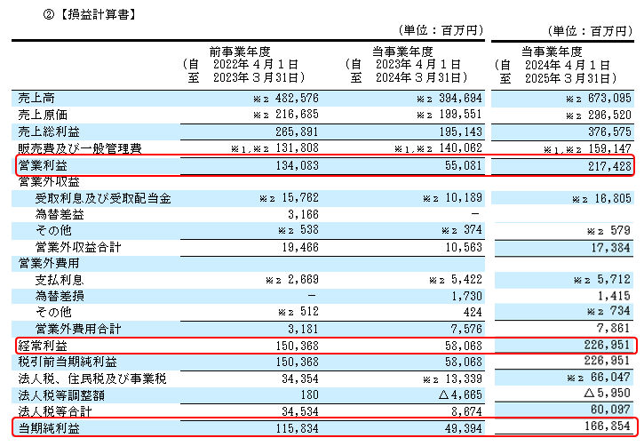 下図の有価証券報告書の損益計算書に示されるように、2024年3月決算では利益が前年より減少しました。そのため2024年の株価は下がったと思われます。
