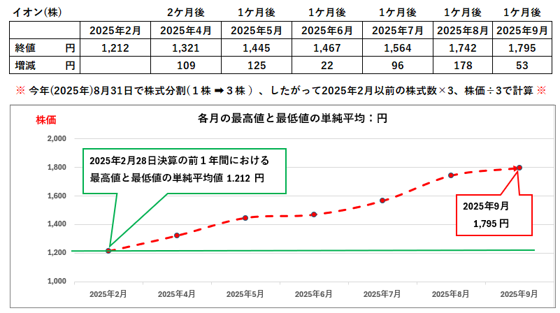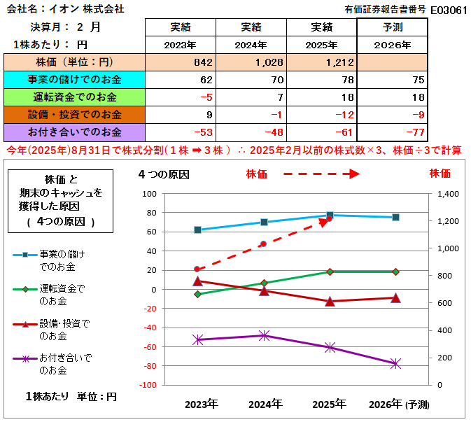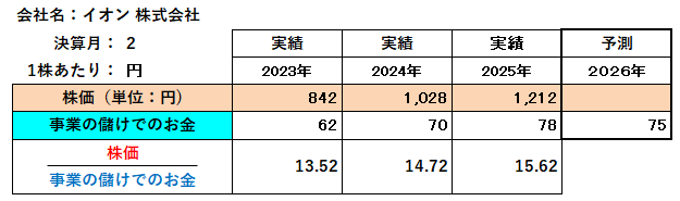 イオンの株価は2025年3月の決算後から上昇しています。財務については上述のとおり2026年の予測結果も含め、良好な財務内容を示しています。しかし、株価が今後永続的に上昇し続けるほどとは思えません。「株価」が「事業の儲けでのお金」の何倍で推移しているかをみると15.62倍でむしろ割高気味と思われます。(株価はその年の最高株価と最低株価の単純平均値です。)
