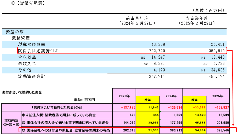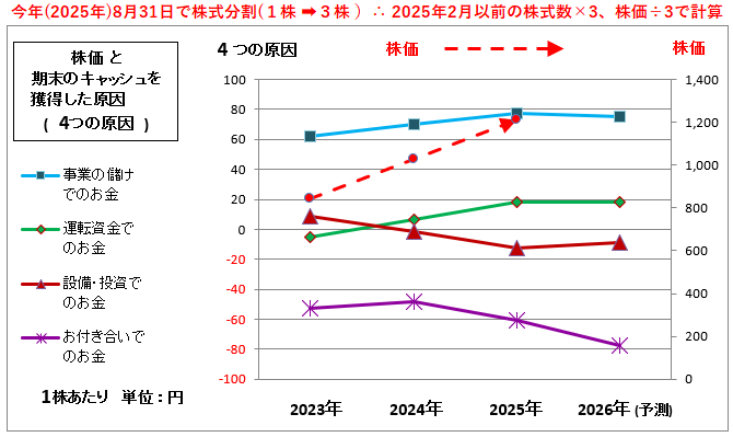 紫色のグラフ「お付き合いで獲得したお金」が2025年に下降しているのは。「関係会社短期貸付金」が大きく増加したためです。この「関係会社短期貸付金」は3期連続して増加していますから、それを踏まえて来期の2026年も同じ金額が増加する(お金が社外に出ていく)と予測しています。