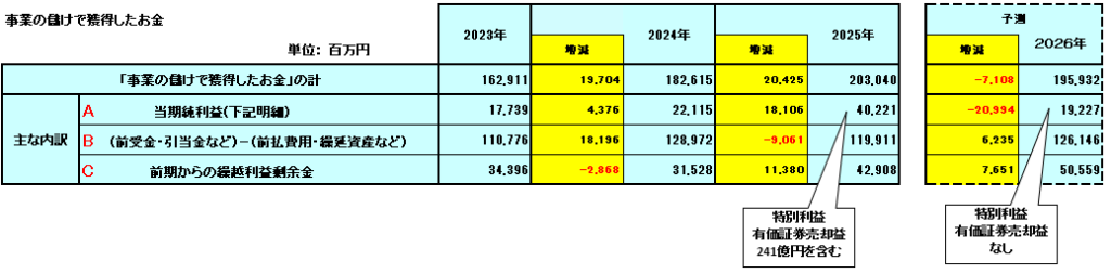 ではこの特別利益は来期の2026年に同じような金額で発生するでしょうか。発生しないはずです。したがって、2026年の予測においてはこの特別利益(特別損失)はゼロとしています。これが予測(2026年)の「事業の儲けでのお金」が伸びていない大きな理由です。