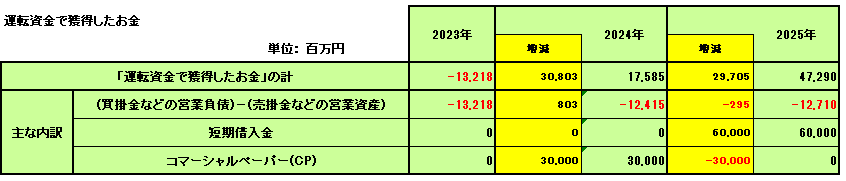 緑色のグラフ「運転資金で獲得したお金」が2025年に上昇しているのは、下図のとおり2「短期借入金」600億円が発生したためです。しかし、予測(2026年)においてこの「短期借入金」は増加・減少することはない、つまり、当期と同じ残高で推移する仮定しています。