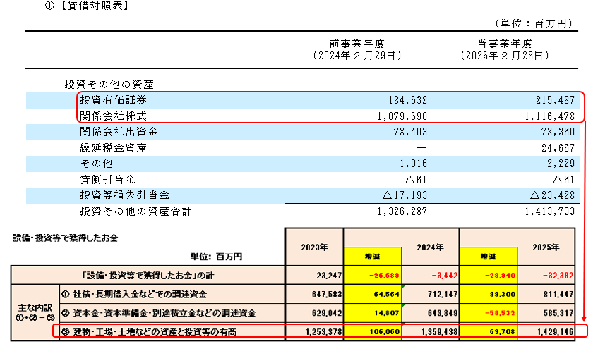 茶色のグラフ「設備・投資等で獲得したお金」が2025年に下降しているのは、下図の③「建物・工場・土地などの資産と投資等の有高」の増加金額中、「投資有価証券」の増加約609億円、「関係会社株式」の増加約369億円のためです。しかし、予測(2026年)では増加はなし、つまり、当期と同じ残高で推移する仮定しています。