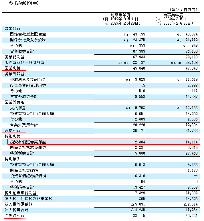 イオンの当期純利益、つまり、最終の利益は2025年2月決算で約402億円です。前期の約221億円に比べて約181億円増加しているため「182%のアップだ!、イオンは儲かっているぞ!、株価は上がる!」と考える方もいるかも知れません。しかし、2025年2月決算で約402億円の中身を見ると、赤枠の「投資有価証券売却益」の特別利益約241億円があったためと分かります。