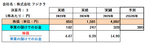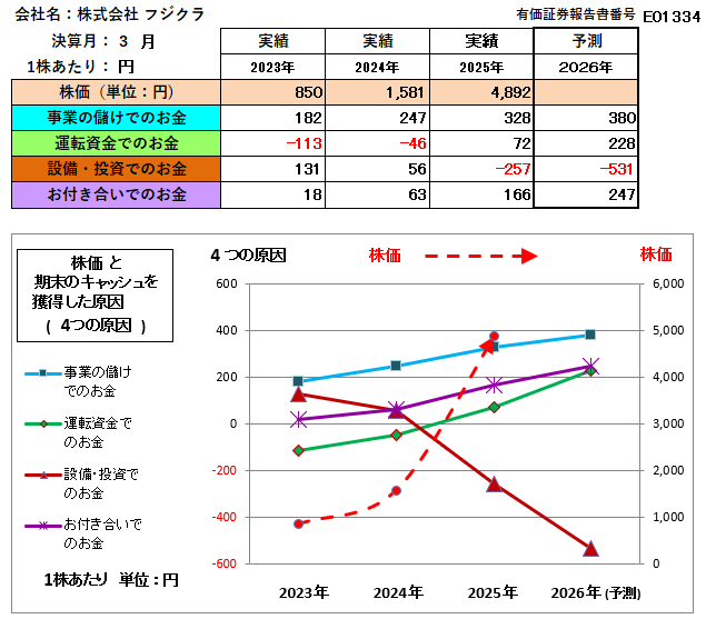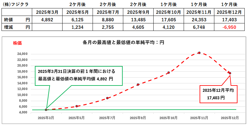 上記の通り(株)フジクラの財務状況は、関係会社との資金の動きに留意する以外には、問題点や課題は見当たらず良好な財務内容を示しています。しかし株価は、2025年3月決算以降に急騰しながら12月には急落しました。これは株式市場の動向や業界内部の様々な要因によると思われますが、財務的判断として「株価」が「事業の儲けでのお金」の何倍で推移しているかをみると、2023年が4.67倍 ➡2024年が6.39倍 ➡2025年が14.90倍と異常に高くなっています。したがって今後は、2025年12月の株価(月の最高値と最低値の単純平均)の動きと同じように下落し、決算期末時点ぐらいまで下がる可能性も考えられます。