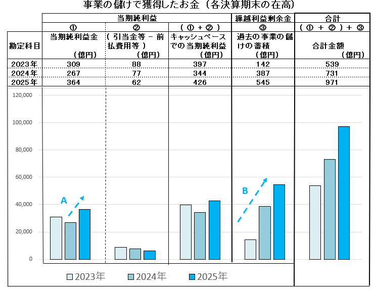 青色のグラフ「事業の儲けでのお金」は順調に増加しています。つまり、業績は順調に伸びています。当期1年間で稼いだお金は前期に比べて伸び ( ・・A )、支出された配当金等の残りで前期以前から蓄積されているお金 ( ・・B ) も順調に積み上がっています。
