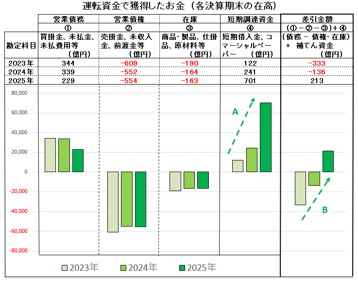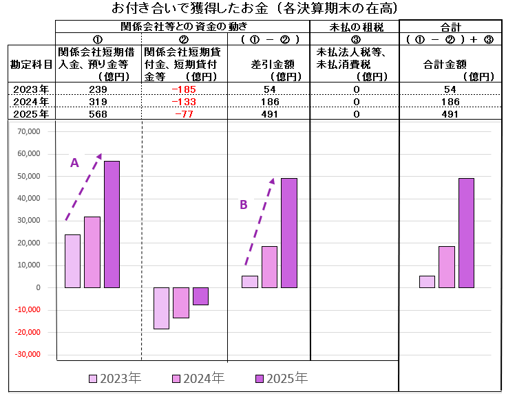 紫色のグラフ「お付き合いでのお金」の動きの中で、特に「関係会社短期借入金」が急増しています。これは子会社などから資金を吸い上げた結果と想定されますが、この資金が今後どのように使われるのか留意したいと思います。なお、子会社などの関係会社に対する資金の貸付は逆に減少していますが、相殺計算すると、この「お付き合いでのお金」は増加( ・・B )しています。