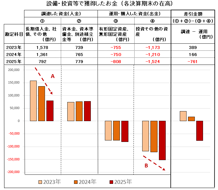 このグラフで注目すべきは、茶色のグラフ「設備・投資等でのお金」が急激にマイナスへ向かって下降していることです。はたして無理な投資のためにお金がマイナスになってしまったのでしょうか、あるいは過去の設備・投資の時に調達した長期借入金等の返済のためにお金がマイナスになってしまったのでしょうか。