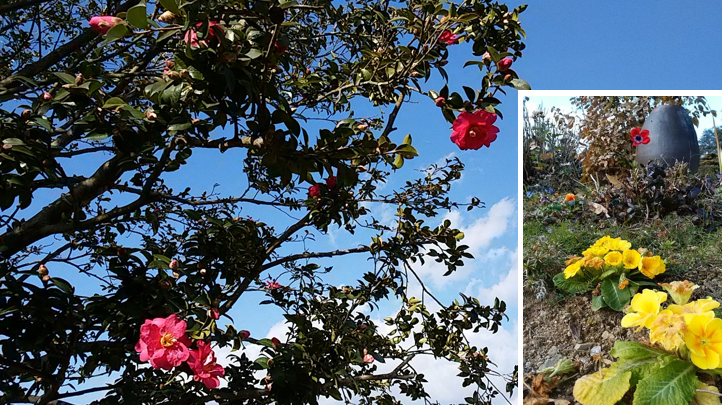 今週の「九州テクテク歩き」 : 筑後の国 ( 福岡県 ) に東西に連なる耳納連山 ( みのう れんざん ) の青空には赤い椿が咲き、大地には名も知らぬ黄色い花が咲いていました。